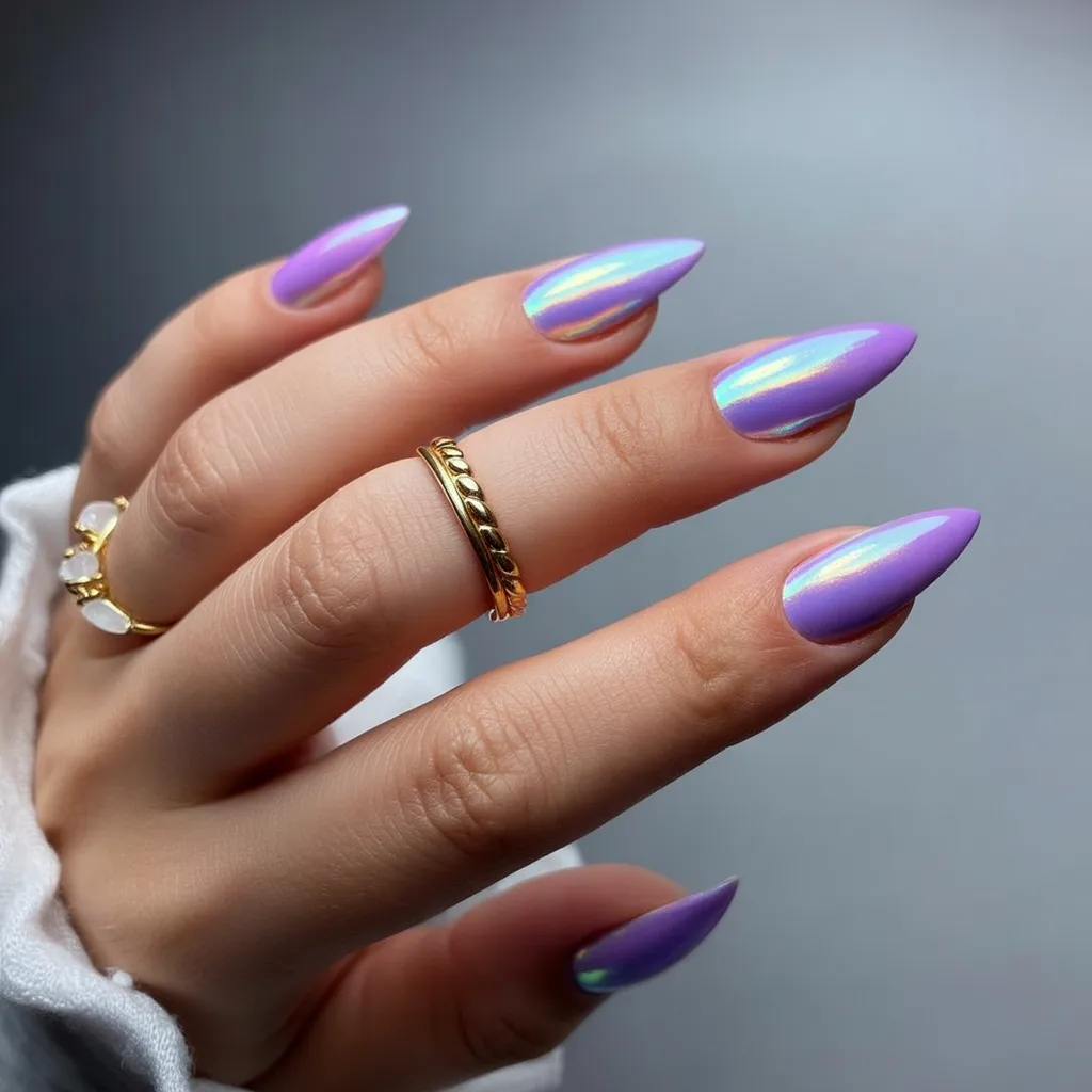 This look feels futuristic yet soft at the same time. The purple chrome finish reflects light beautifully, creating a dreamy, shifting glow that feels modern and expressive. It’s bold, artistic, and perfect for those moments when you want your nails to feel like a statement.