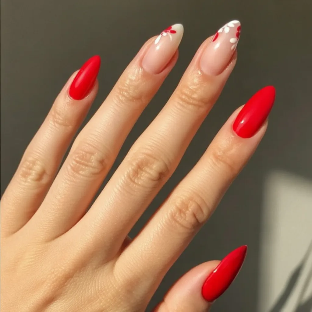 Red nails always carry confidence, but this version softens the look with delicate floral accents. It feels powerful yet feminine, bold yet wearable. The contrast between classic red and gentle details makes this manicure feel thoughtful and intentional—never harsh.