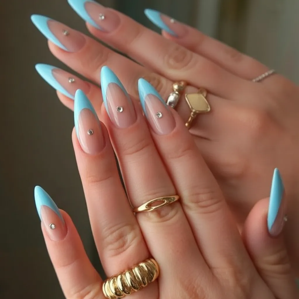 This manicure feels airy, elegant, and quietly glamorous. The soft blue French tips give a refreshing update to a classic style, while the tiny crystal accents add just enough sparkle to catch the light. It’s calm but polished, making it perfect for both everyday wear and special moments.