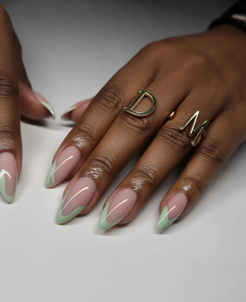 This curved French design feels playful and fresh. The soft pink base paired with green tips creates a gentle contrast that feels lively without being overwhelming. It’s modern, feminine, and has that relaxed spring energy that instantly brightens your look.
