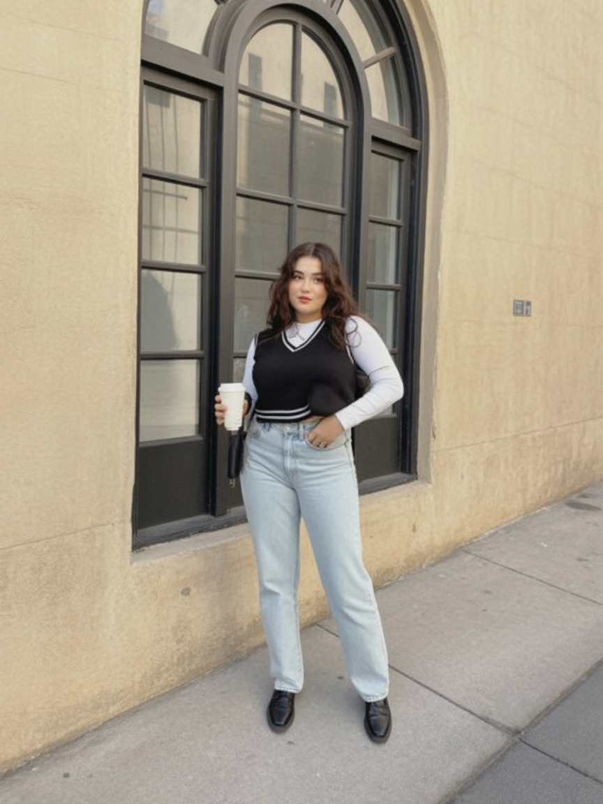 This look feels youthful, playful, and quietly stylish. The layered vest adds interest, while the white shirt keeps it crisp and office-appropriate. It’s relaxed but thoughtful—like you enjoy fashion without taking it too seriously.
