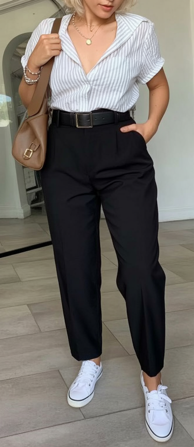 There’s something quietly powerful about a look that doesn’t try too hard. This outfit feels like that woman who walks into the office already knowing she belongs there. The relaxed stripe shirt softens the mood, while the sharp black trousers keep things grounded and professional. It’s clean and confident and gives off that effortless office chic energy that always works, especially on busy mornings when you want to look pulled together without overthinking it.