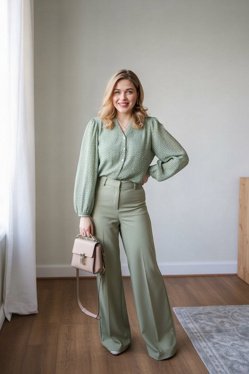 2. Soft Green Blouse with Fluid Wide-Leg Pants