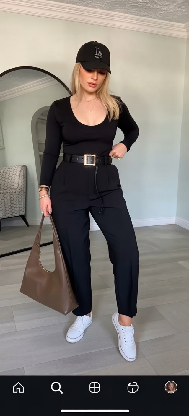 This outfit has attitude—confident, modern, and slightly unexpected. The all-black base feels sleek and powerful, while the cap adds a casual twist that keeps the look current and fun. It’s bold without being overdone.