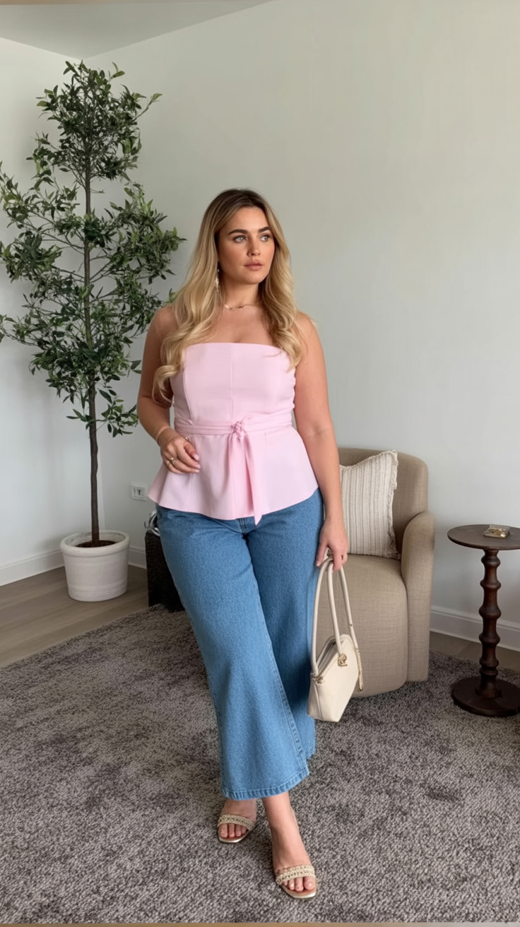 This look feels romantic and confident at the same time—the kind of outfit that quietly turns heads without asking for attention. The soft pink peplum top adds a gentle, feminine structure, while the relaxed denim keeps the mood grounded and modern. It’s sweet but grown-up, light but still intentional, and perfect for those spring days when you want to feel fresh and put together.