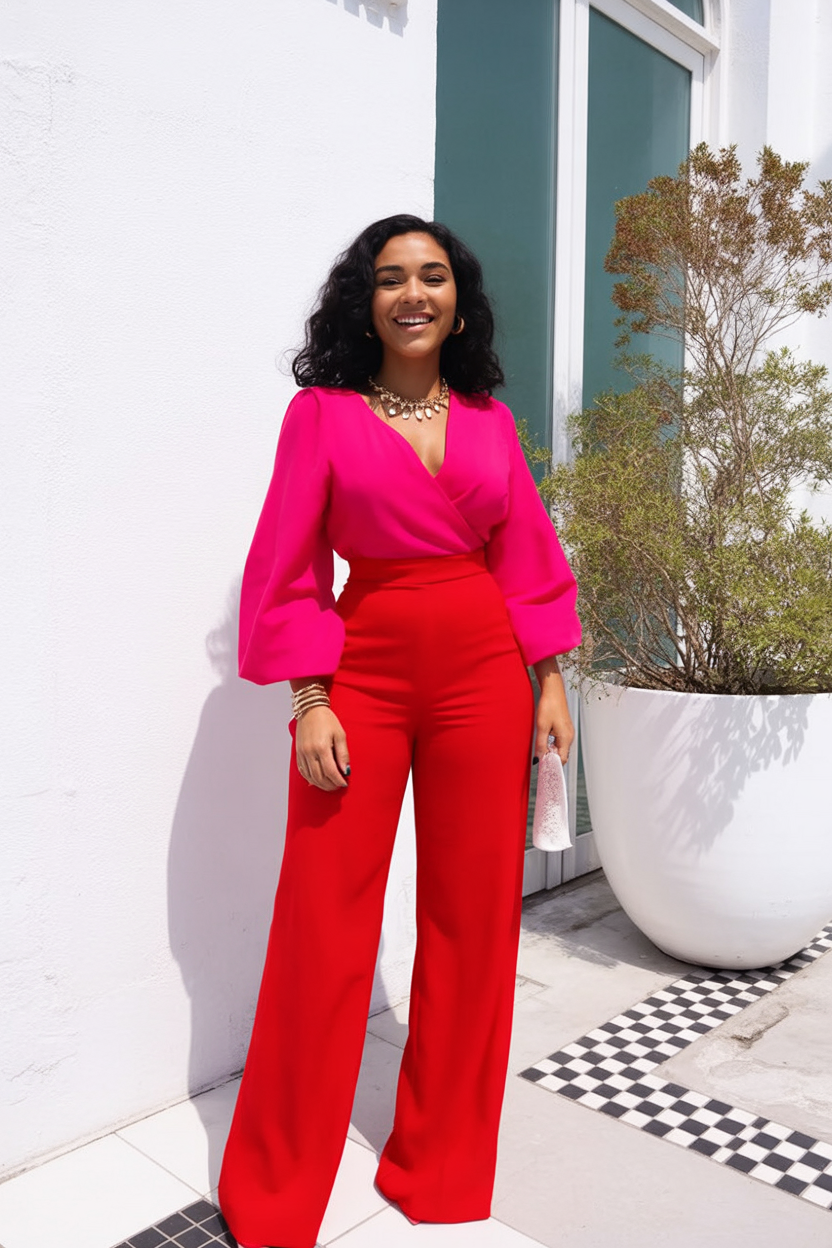 8. Fuchsia Blouse with Red Wide-Leg Pants