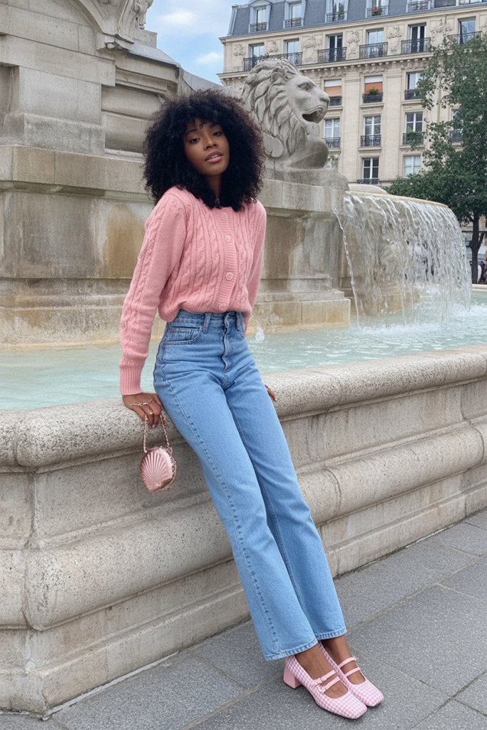 There’s something irresistibly charming about this look. The soft pink knit feels cozy and romantic, while the relaxed denim keeps it grounded and modern. It has that effortless European spring vibe—relaxed, confident, and quietly cute without trying to impress.