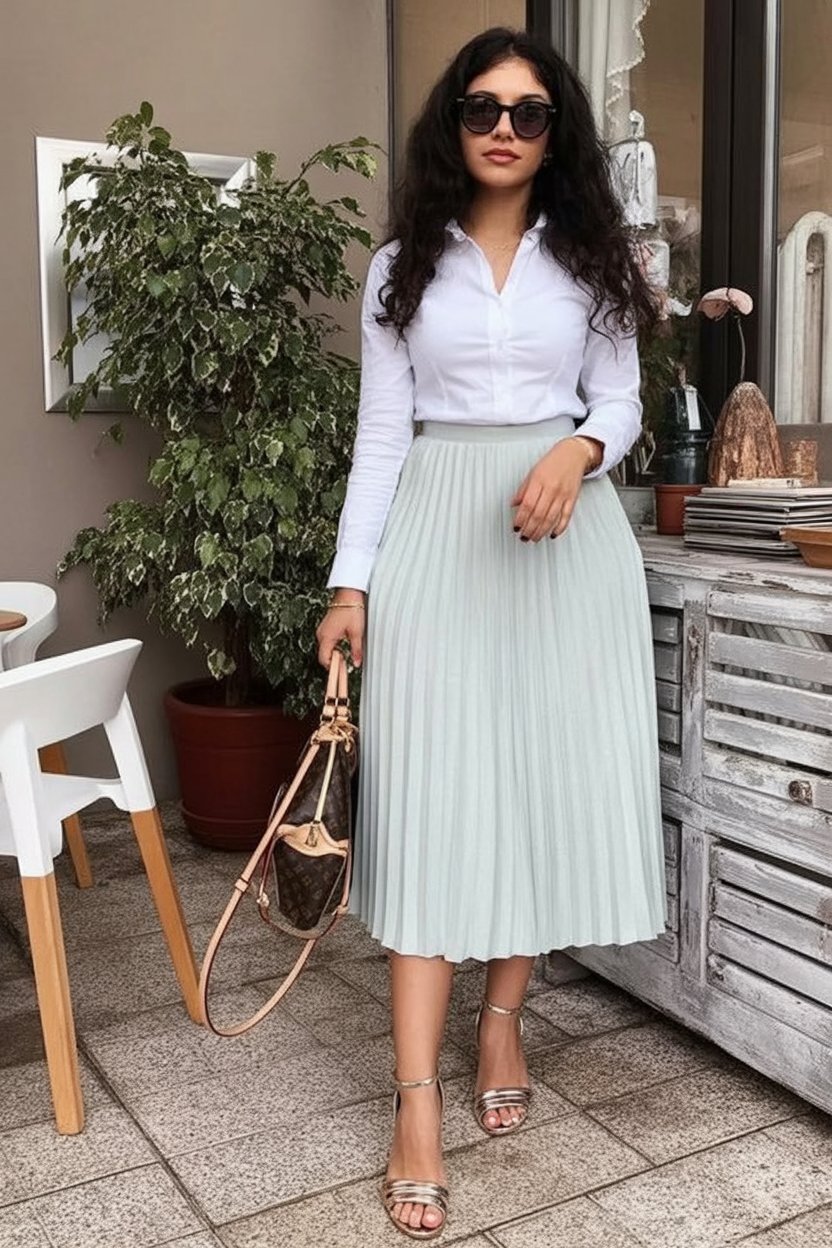 16. Crisp White Shirt with Pleated Midi Skirt