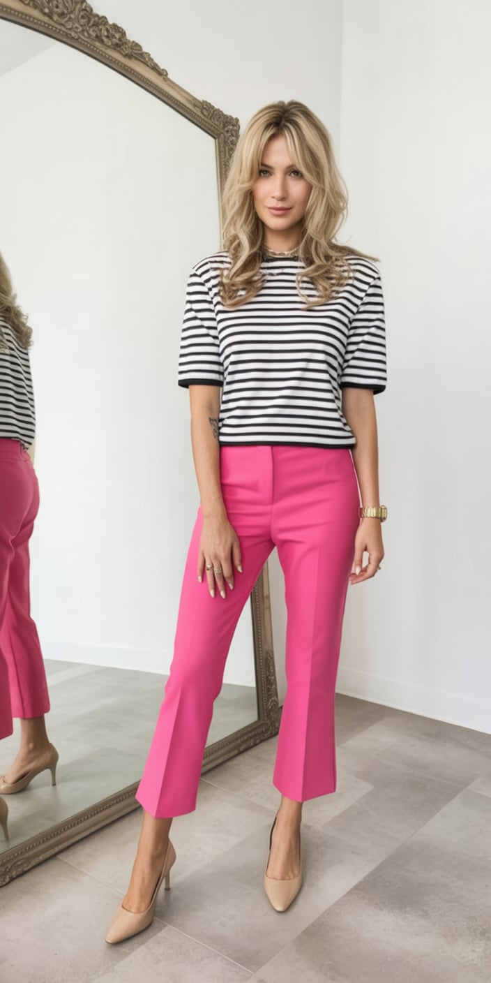 This look is pure confidence. The bright pink pants instantly energize the outfit, while the striped top keeps it grounded and wearable. It’s playful but polished and perfect for women who love color without feeling overdone.