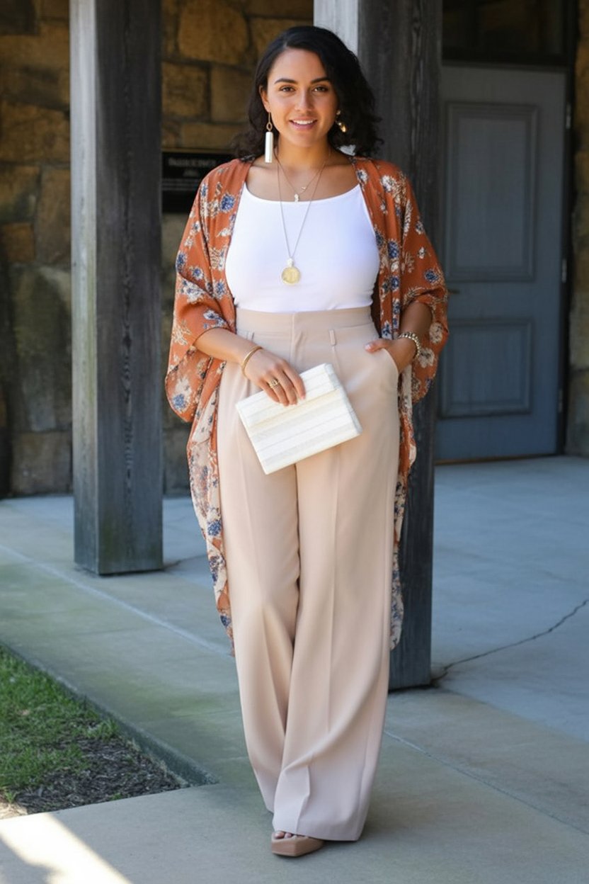 10. Neutral Wide-Leg Pants with Soft Printed Kimono