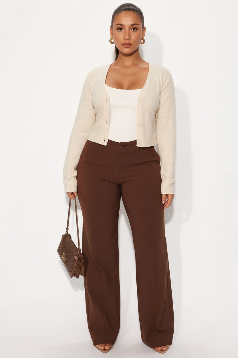 22. Cream Cardigan with Chocolate Wide-Leg Trousers