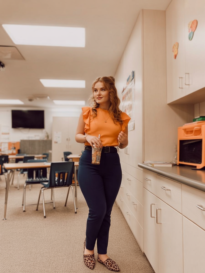 This look feels warm, friendly, and energetic—perfect for spring days when you want a little color without going full bold. The ruffle detail adds softness, while the fitted pants keep the outfit structured and work-ready.