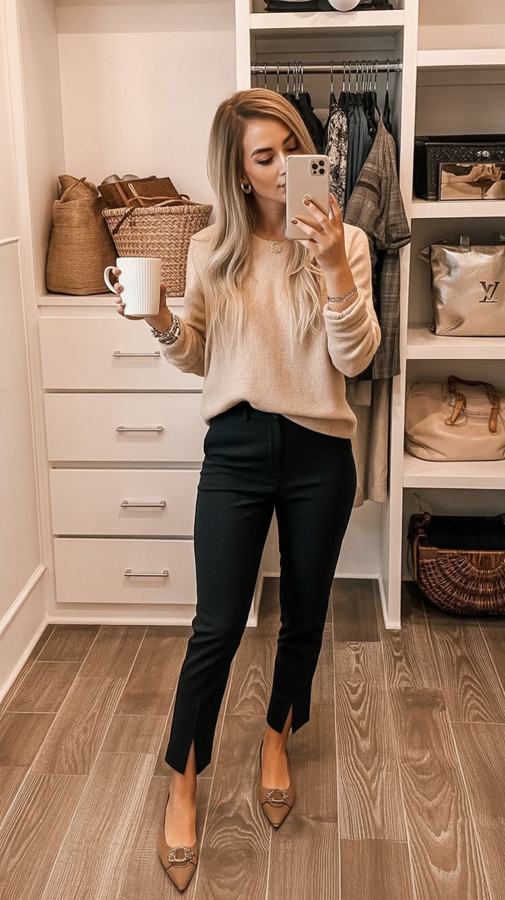 15. Cozy Neutral Sweater with Tailored Black Pants