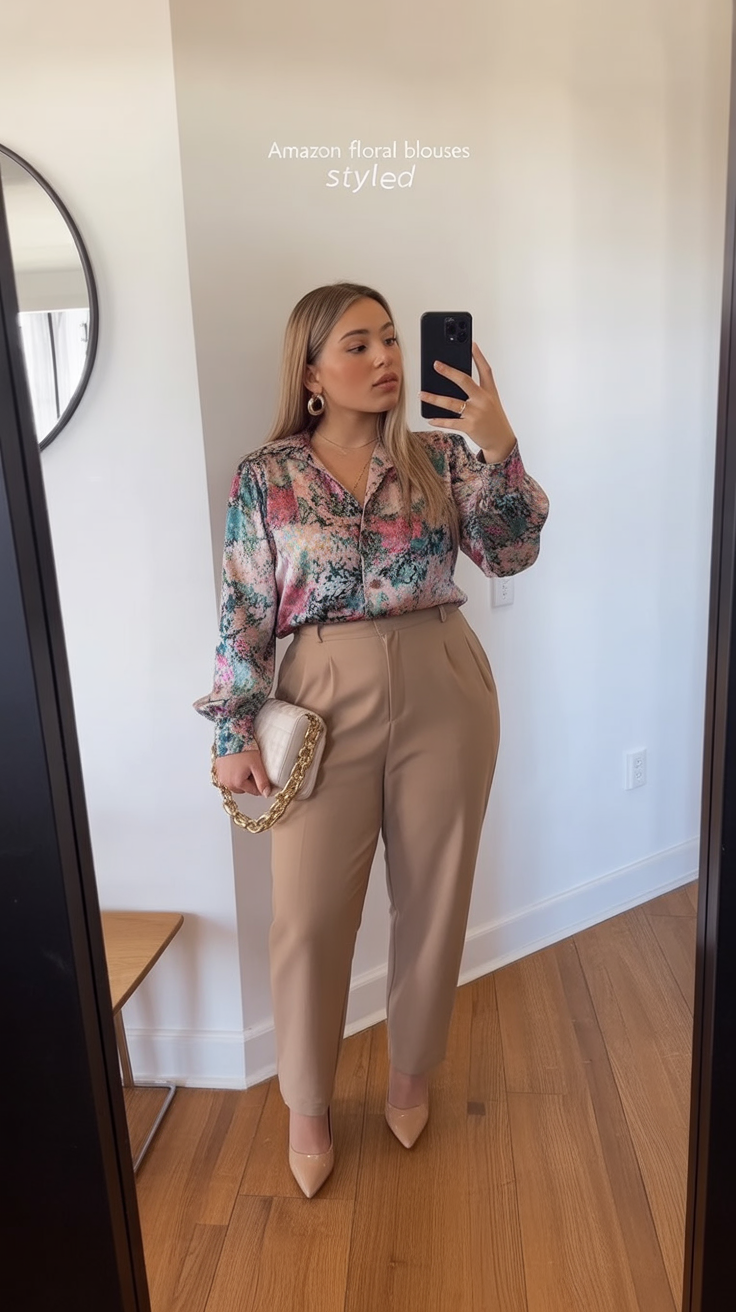 11. Floral Blouse with Tailored Beige Trousers
