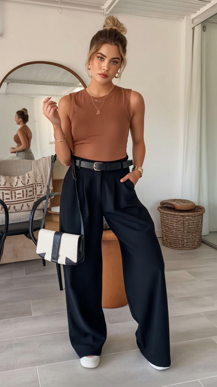 5. Sleeveless Neutral Top with Flowing Black Pants