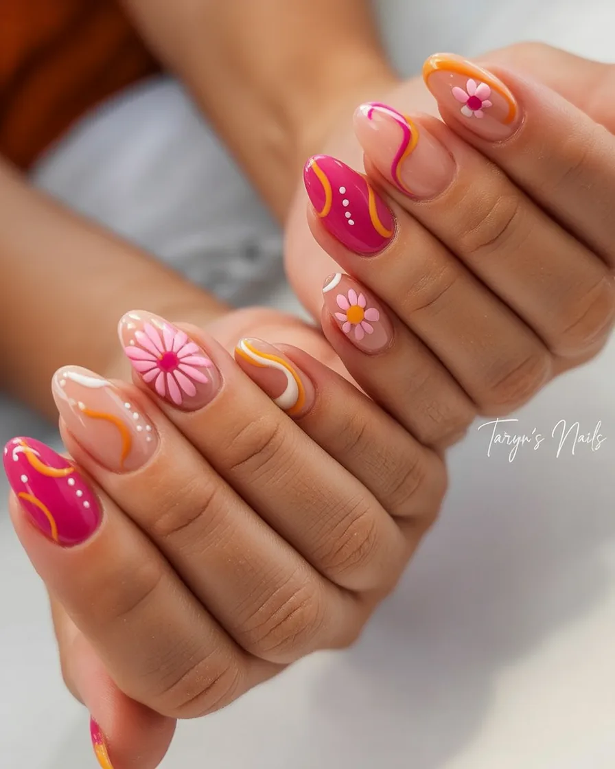 This manicure feels energetic and expressive. The bold pink swirls combined with floral accents create a dynamic, artistic look that feels confident and modern. It’s playful, but there’s real intention behind the design.