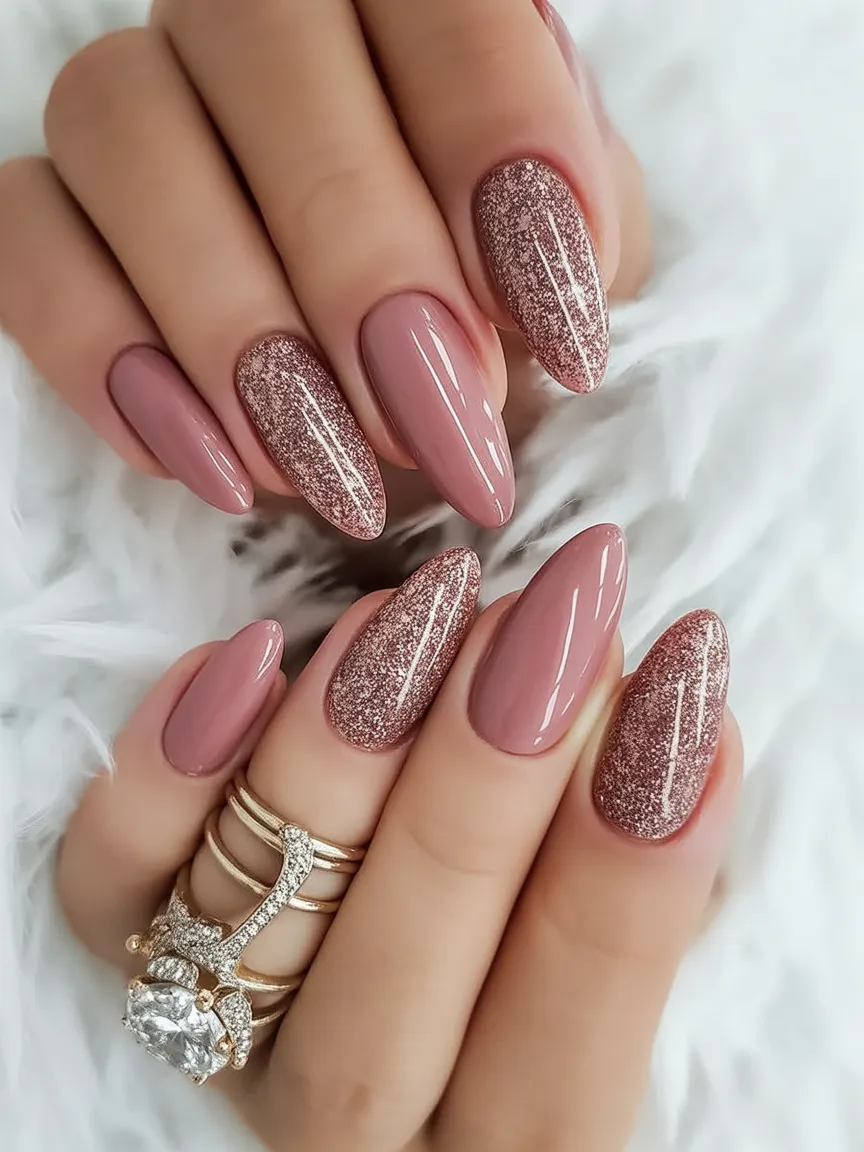 This manicure feels luxurious and feminine, with just the right amount of sparkle. The rose-toned shimmer catches the light beautifully, while the muted base keeps it sophisticated. It’s elegant, confident, and quietly glamorous—perfect for those moments when you want to feel a little extra.
