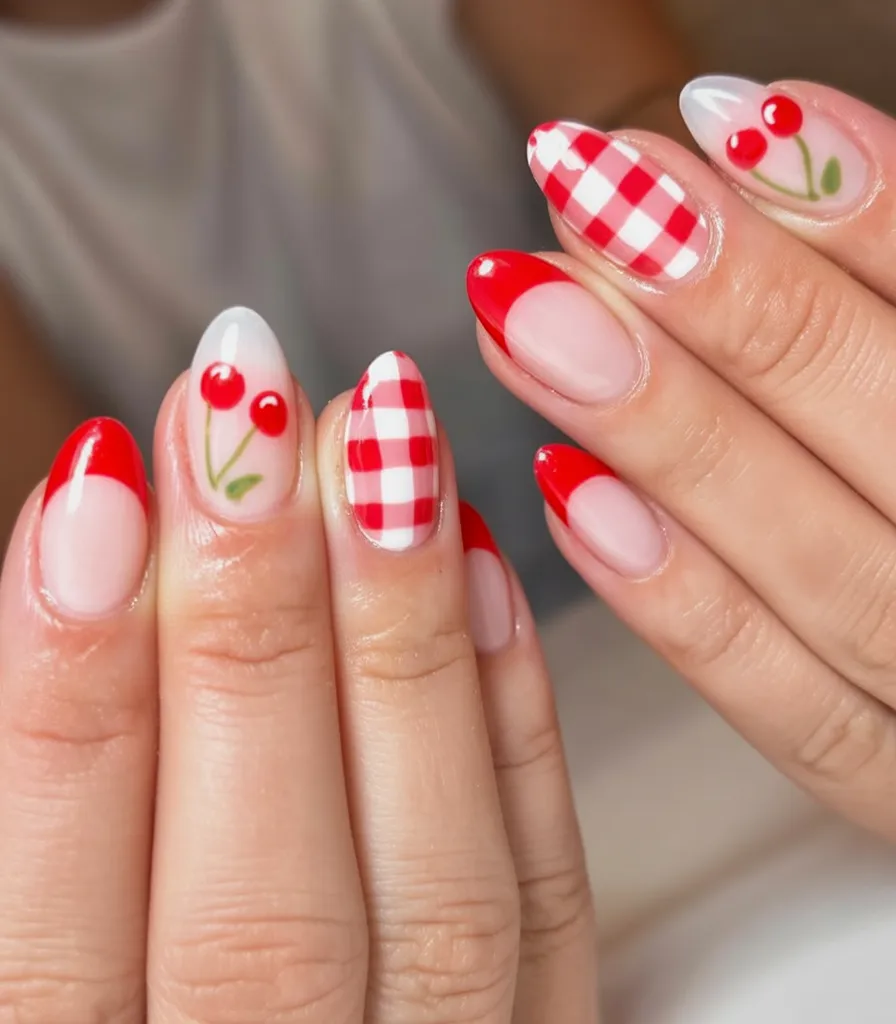 There’s something charmingly nostalgic about this design—it feels like summer picnics, red lipstick, and effortless confidence. The soft base keeps it feminine, while the cherry and gingham details add a playful twist that feels intentional and stylish, not childish. It’s one of those ideas that makes people look twice.