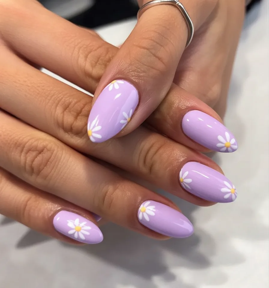 This design feels romantic and dreamy, like fresh flowers on a quiet spring morning. The soft lavender tones paired with floral accents bring a gentle elegance that feels soothing and feminine. It’s delicate without being boring, and the almond shape adds a graceful finish.