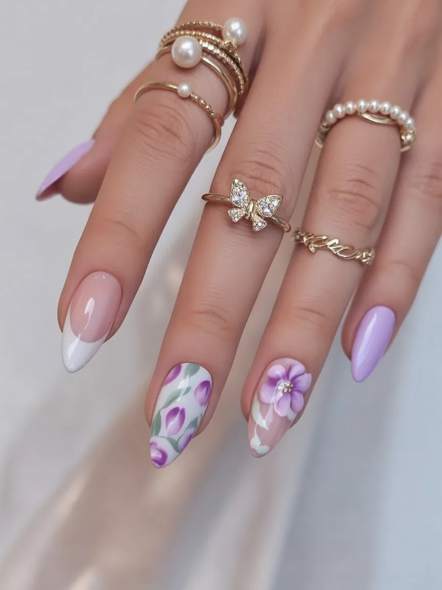 This manicure feels romantic and refined, with a soft mix of French tips, florals, and delicate accents. The purple tones add depth, while the floral details keep it gentle and feminine. It’s elegant without feeling formal.