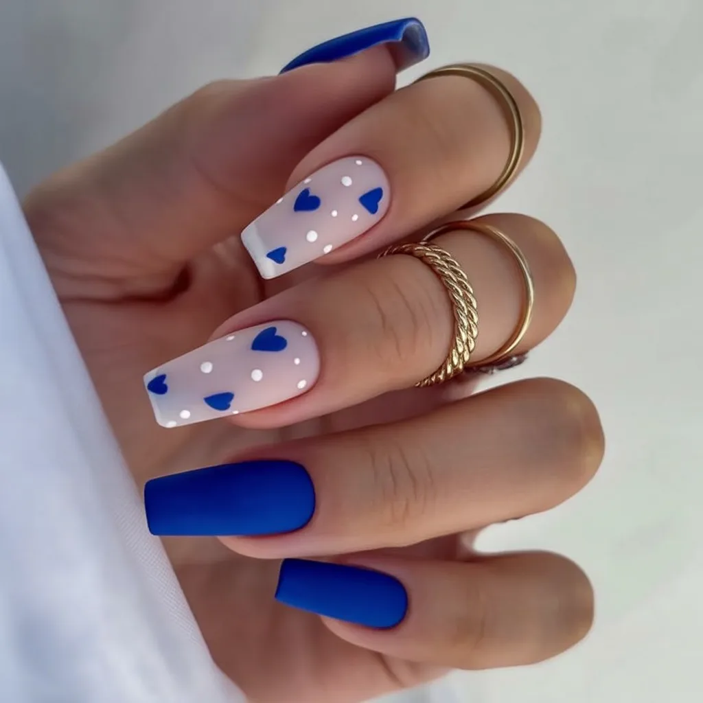 This manicure has attitude in the best way. The bold blue mixed with playful heart details feels confident, modern, and a little flirty. It’s the kind of nail design that says you’re not afraid to stand out, but you still appreciate clean lines and balance.