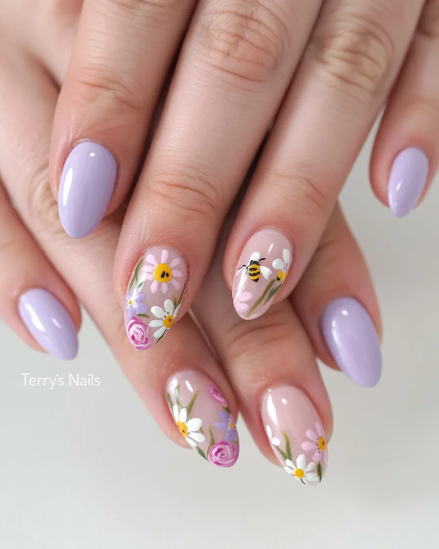 This design feels like a tiny garden captured on your nails. The hand-painted florals and little bee details are charming and artistic, giving the manicure a whimsical, storybook feel. It’s one of those looks that makes you smile every time you notice it.