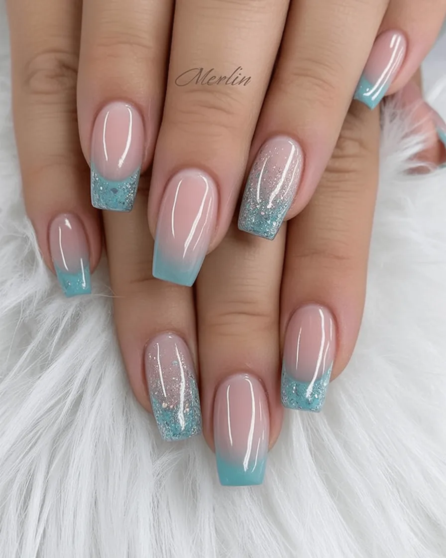 This manicure feels crisp, refreshing, and just a little glamorous. The soft nude base keeps it elegant, while the aqua glitter French tips add that icy sparkle that instantly catches the eye. It has a clean, polished vibe with a playful twist—perfect for feeling put-together without looking overdone.