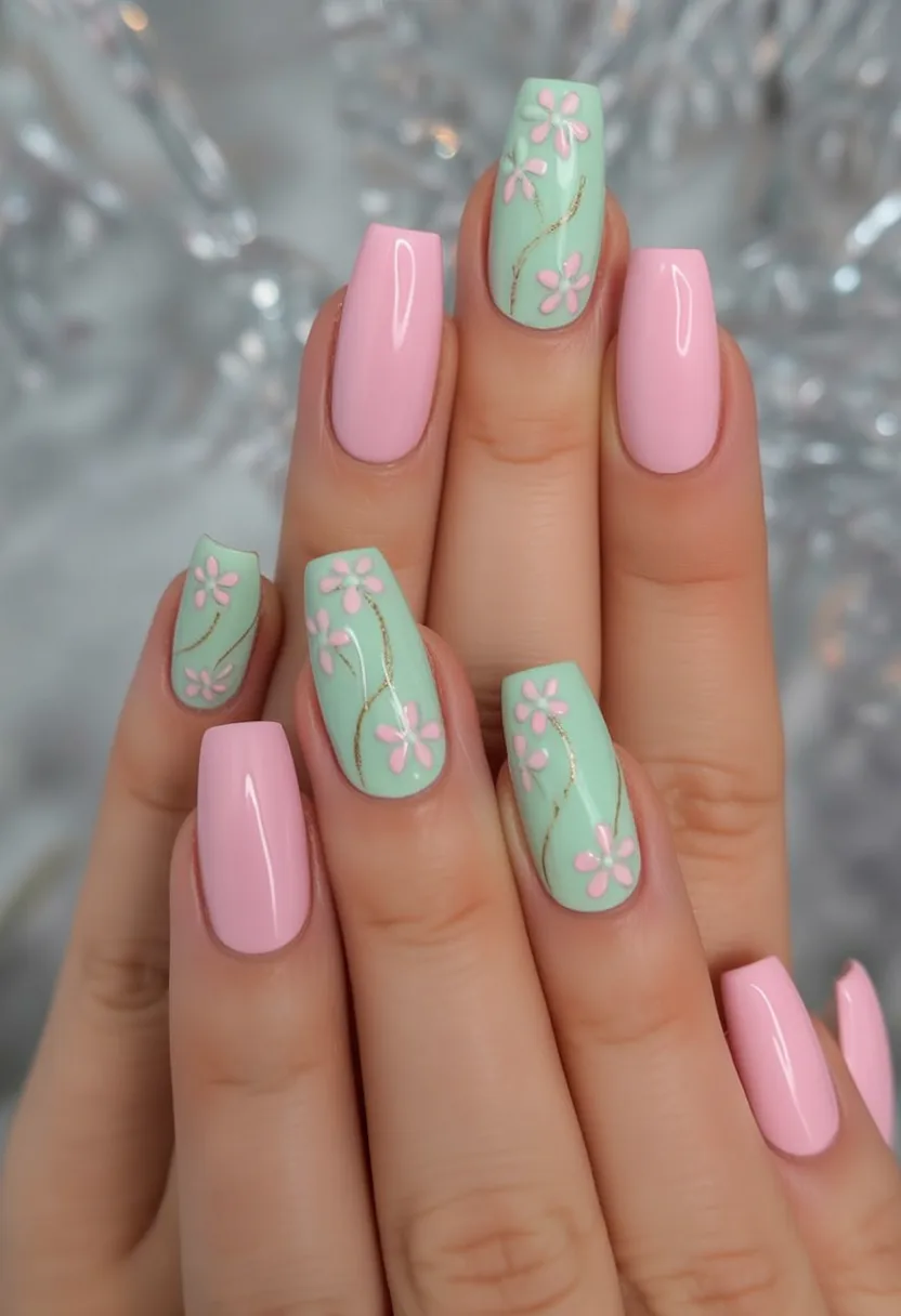 This manicure feels soft, serene, and quietly romantic. The combination of mint and blush has a calming effect, like a deep breath after a busy week. The delicate floral accents add just enough detail to feel special, making this design perfect for someone who loves subtle beauty with a thoughtful touch.