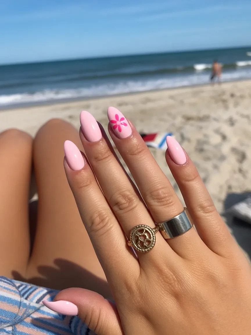This set feels like sunshine, salty air, and carefree summer energy. The soft pink almond nails are classic and flattering, while the single floral accent adds a sweet, personal touch. It’s relaxed, feminine, and effortlessly stylish—exactly the kind of manicure that feels right for warm May days.