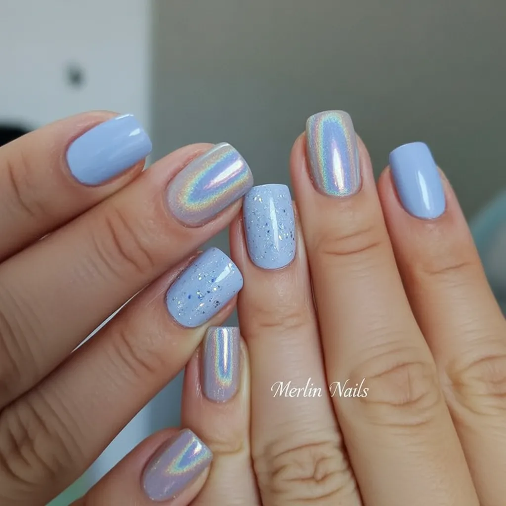 This manicure feels clean, modern, and quietly mesmerizing. The soft icy blue paired with subtle chrome reflections catches the light in a way that feels fresh and polished without screaming for attention. It has that cool, confident energy—like crisp morning air and a perfectly tailored outfit.