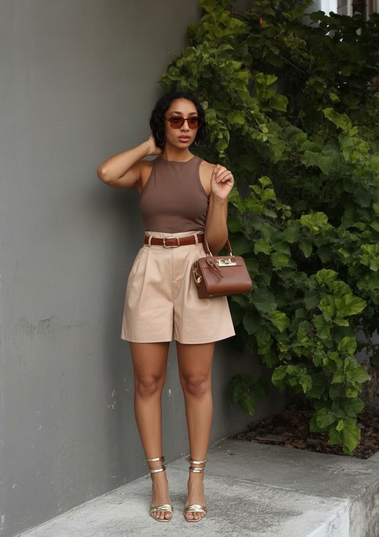 This outfit proves that neutrals are anything but boring. A fitted black tank tucked into softly pleated beige shorts creates such a flattering line, especially with the brown belt defining the waist. The slightly longer hem feels sophisticated yet breezy, and the structured handbag and metallic heels add a dressy finishing touch. It’s the kind of look you could wear to a summer event, a nicer brunch, or even a relaxed formal gathering without feeling underdressed.