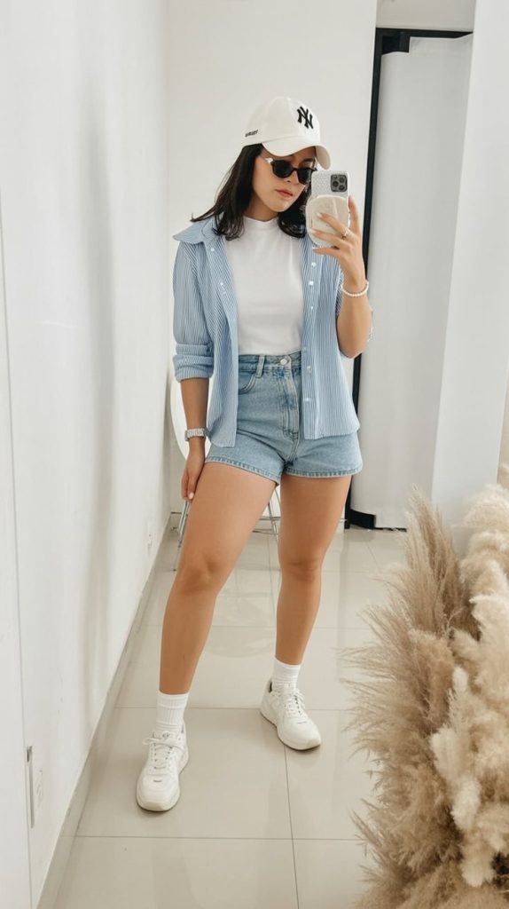 21. Baseball Cap, Blue Shirt and Denim Shorts