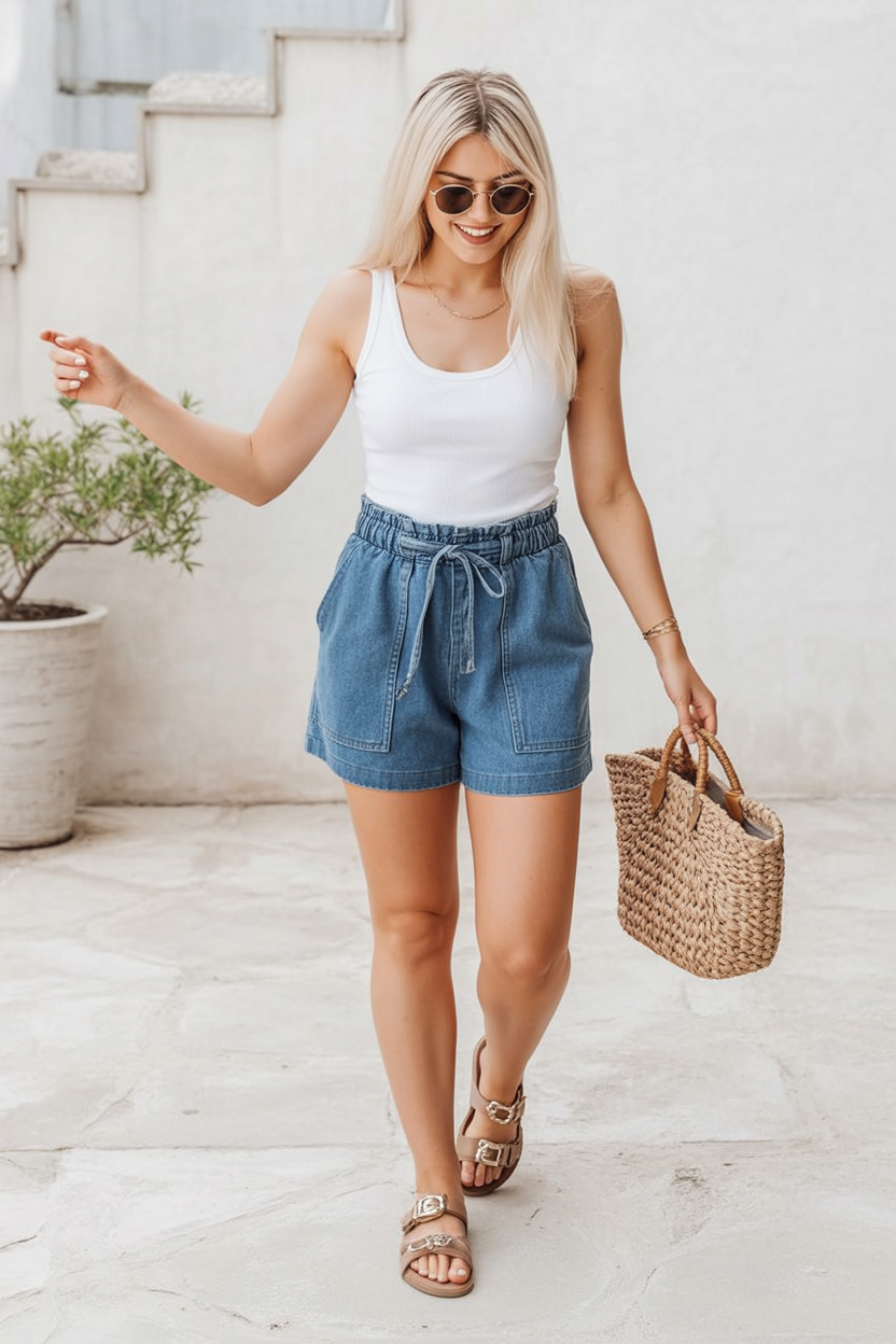 This final look feels like the start of a really good vacation day. A ribbed white tank keeps the top half clean and simple, while soft blue paperbag shorts with a drawstring waist add movement and comfort. The straw tote and slide sandals lean into that relaxed beach mood, but the overall silhouette still looks neat and intentional. It’s the kind of outfit you can wear from breakfast at a café straight to a seaside stroll without changing a thing.