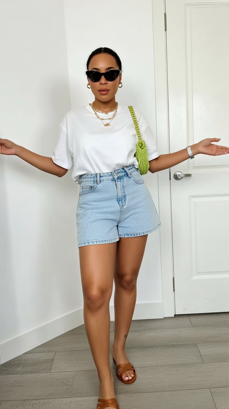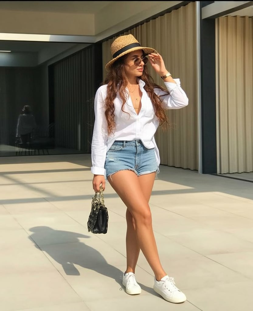 This is the cool-girl version of a summer uniform: a black crop top, classic blue denim shorts, and an oversized light blue shirt thrown on top. The mix of structured tailoring and relaxed layers gives serious street-style energy while still being totally wearable. White slides, a chunky chain necklace, and a brown mini bag keep it from feeling too casual, making this a perfect look for city strolls, casual dates, or going out for rooftop drinks.