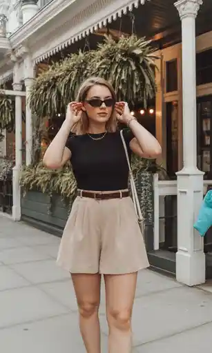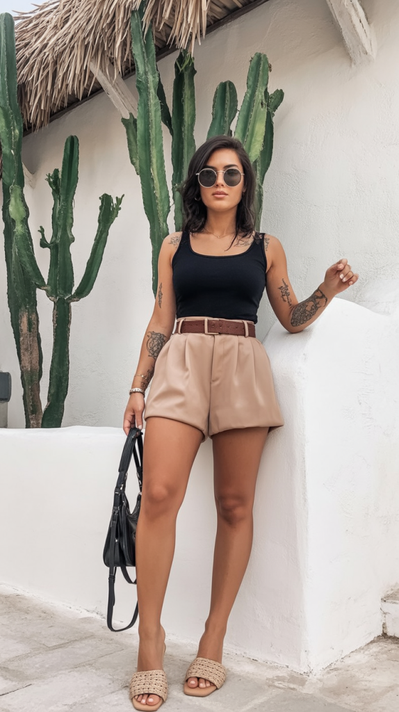 This outfit exudes pure summer self-assurance with its streamlined black tank, pleated beige shorts that fit your hips like they were painted there, and your woven slides that shout “beach getaway” even when you’re only picking up milk and eggs. The high waist and rolled hem elongate your legs, and your brown belt lets all of your fashion details come together in one tidy package. Oversized sunglasses and your choice of designer bag keep things smooth rather than slouchy, making you feel as good heading to brunch as you will scouring the market at your favorite coastal town.