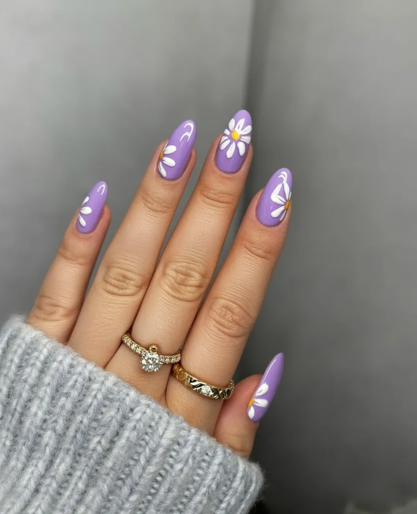 14. Lilac Daisy Almond Nails