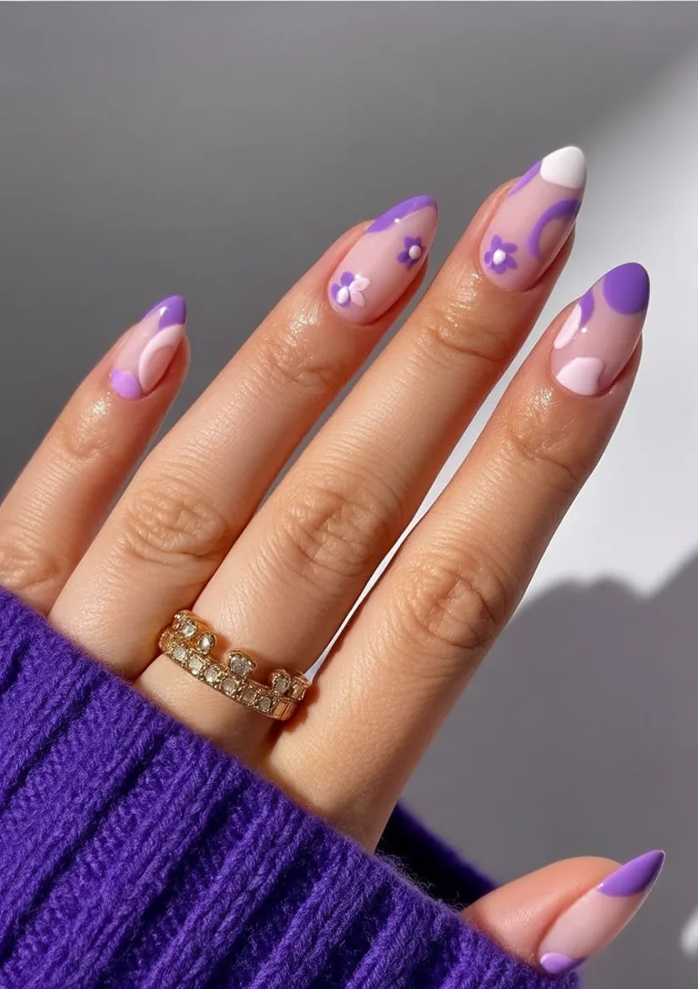 17. Purple Abstract Floral Almond Nails