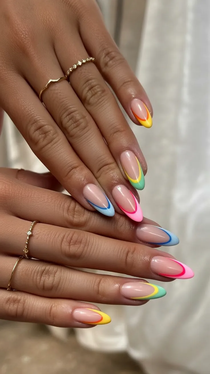 If you’re drawn to 2026 ideas that feel fresh but still wearable, this is it. Almond nails are ideal here because they soften the bold colors. Ask your nail tech for pastel yellow, blue, green, and pink tips for a cohesive look. This style is surprisingly easy to maintain and grows out beautifully.