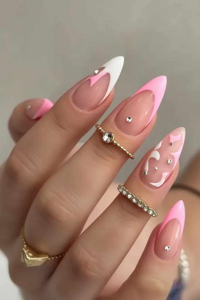 There’s something irresistibly sweet about a fresh pink manicure that doesn’t try too hard. This look feels playful but grown-up, with that soft almond shape instantly making the hands look elegant and feminine. The tiny heart details add a cute, romantic twist without tipping into juvenile territory. It’s the kind of manicure that quietly says you’re in a good mood, feeling open, and leaning into a lighter spring mindset. Perfect for brunch dates, spring weddings, or just because you want your nails to make you smile.