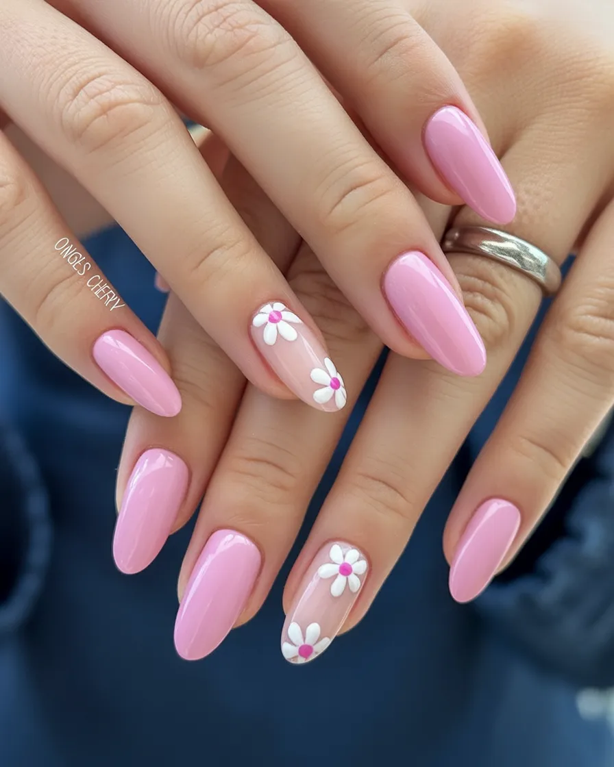 4. Soft Pink Daisy Almond Nails