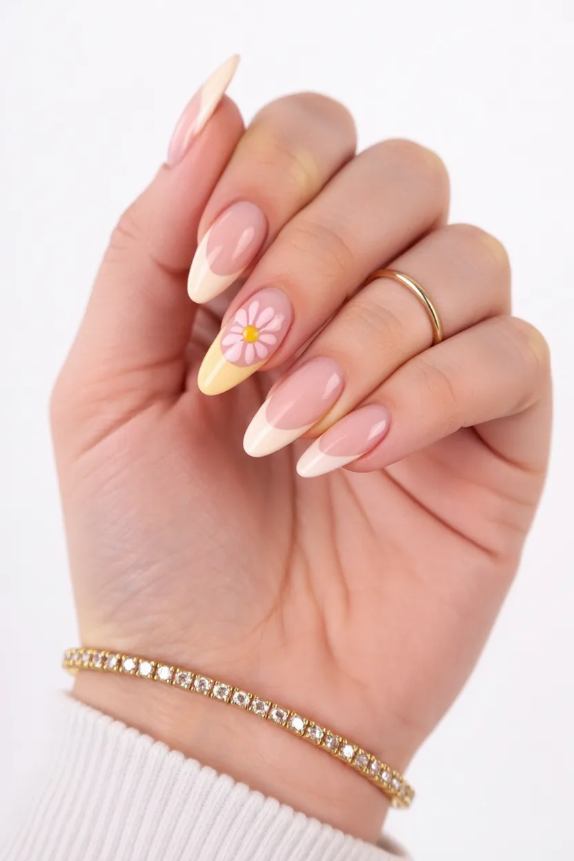 18. Yellow Daisy French Almond Nails