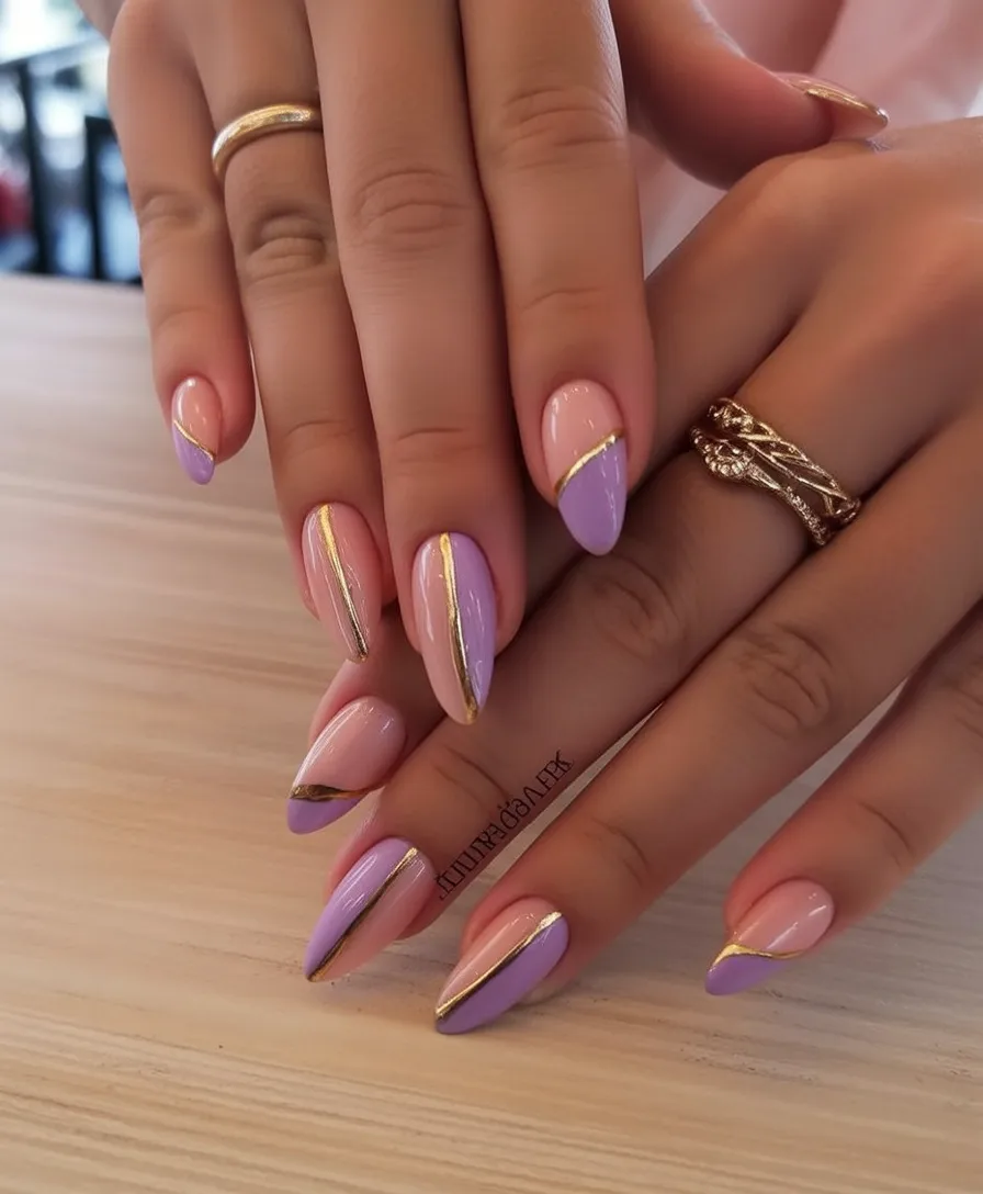 9. Lilac and Gold Accent Almond Nails