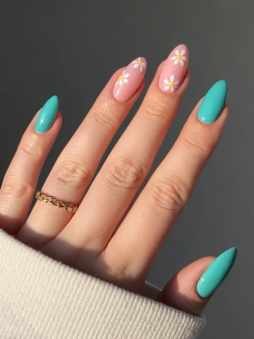 13. Mint and Daisy Almond Nails