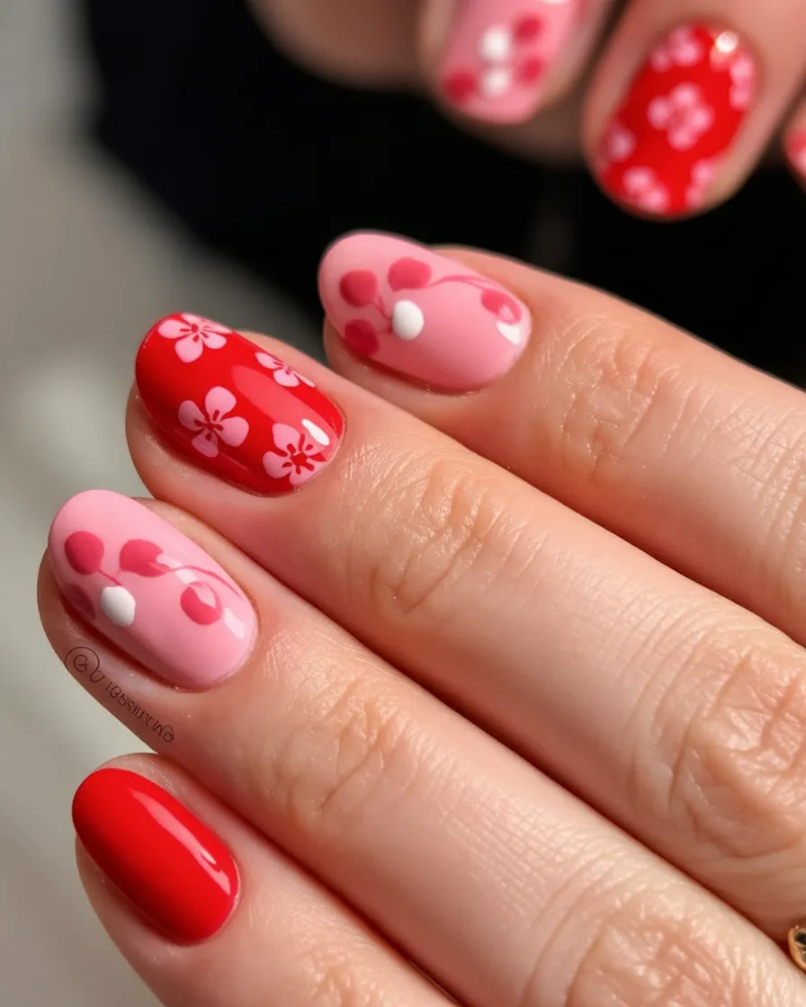 Bold, joyful, and full of personality—these nails don’t whisper, they smile. The mix of vibrant red and soft pink feels energetic yet surprisingly elegant. The floral accents give it a cheerful spring twist that feels fun rather than overpowering. This is the manicure you choose when you’re feeling confident and want your hands to reflect that energy.