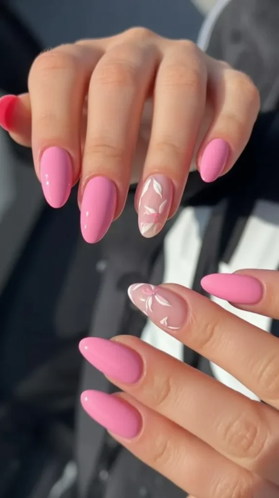 22. Soft Pink Almond Nails with Minimal Floral Accent
