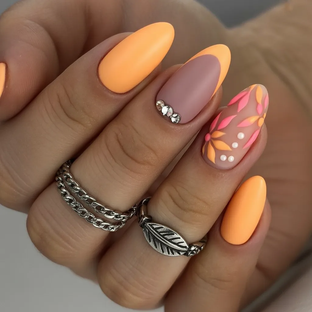 7. Peach and Floral Almond Nails