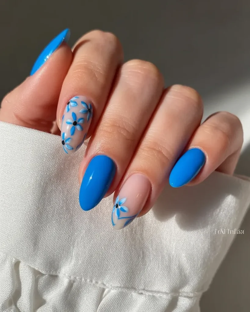 8. Blue Floral Almond Nails