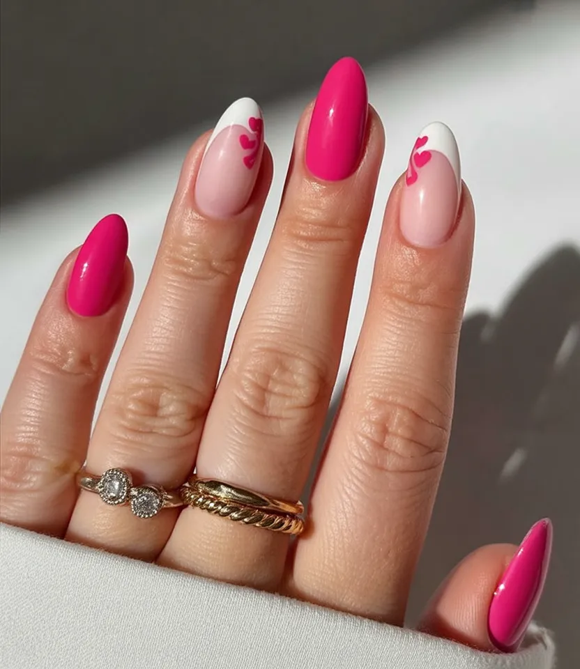 What makes this design special is how it balances simple designs with personality. The almond shape works beautifully on short to medium nails and elongates the fingers naturally. Stick to a glossy finish to keep the pink tones vibrant, and opt for gel if you want the hearts to stay crisp longer. This is one of those 2026 ideas that feels timeless but still very now.