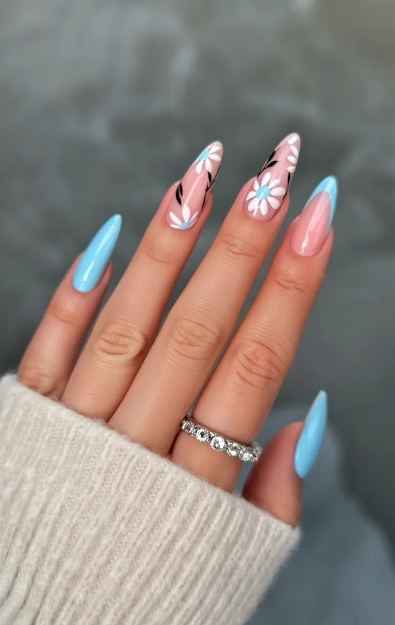 There’s something instantly refreshing about this shade of blue—it feels crisp, confident, and a little unexpected for spring in the best way. Paired with delicate floral art, the look strikes a beautiful balance between bold color and softness. It gives off that “I know exactly who I am” energy while still feeling light and seasonally appropriate. These nails feel modern, stylish, and quietly powerful, perfect for women who like their beauty choices to feel intentional.