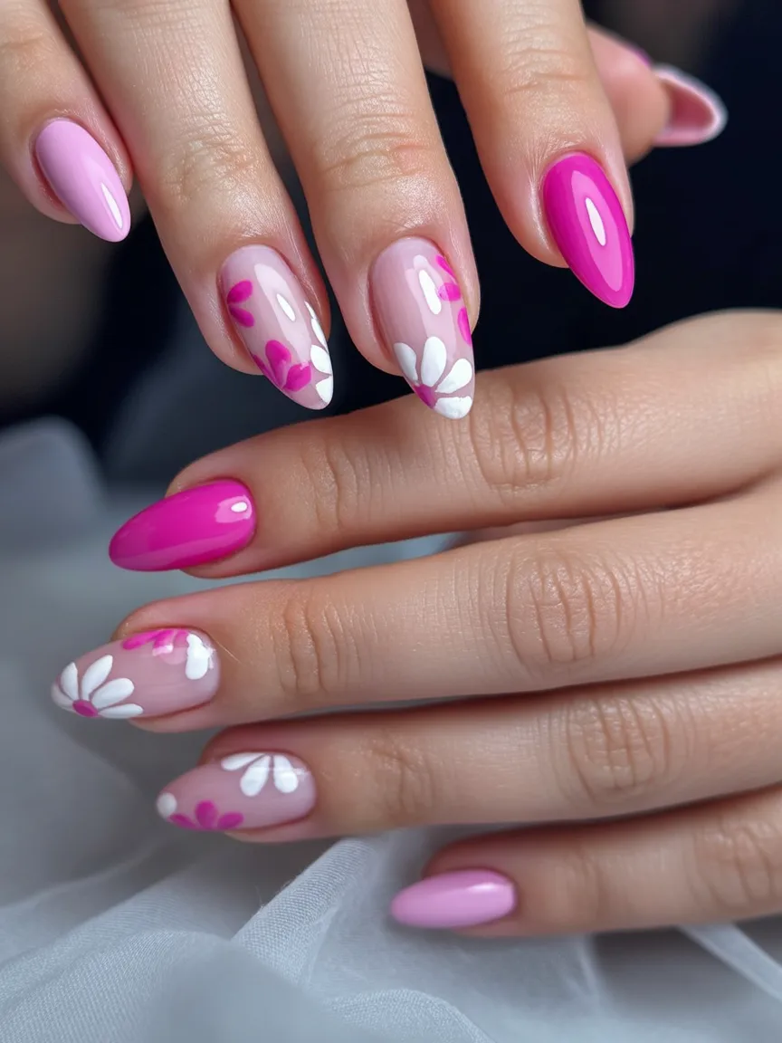 2. Pink Floral Almond Nails